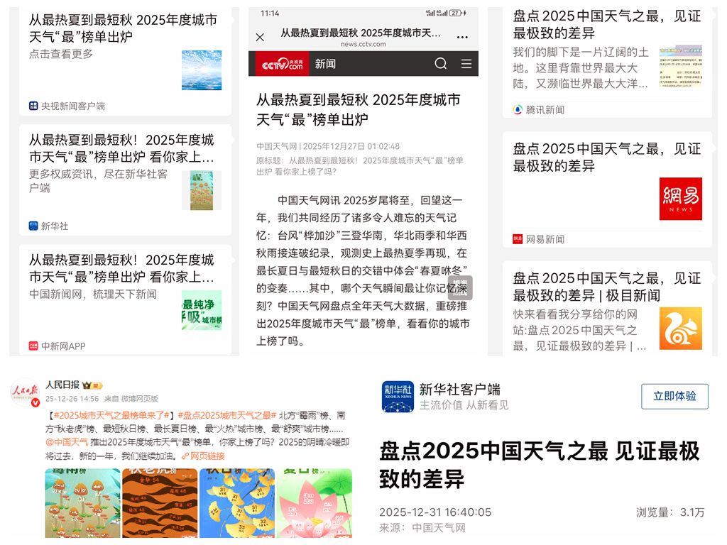 此外,基于全国2429个气象观测站数据,中国天气网策划发布《2025年中国天气的极致在哪里》,以权威数据回顾年度气温之最、年度季节之最等,以独特角度解读我国季风气候特征。推出后,被新华网客户端、北京日报客户端、北晚在线等转载。
