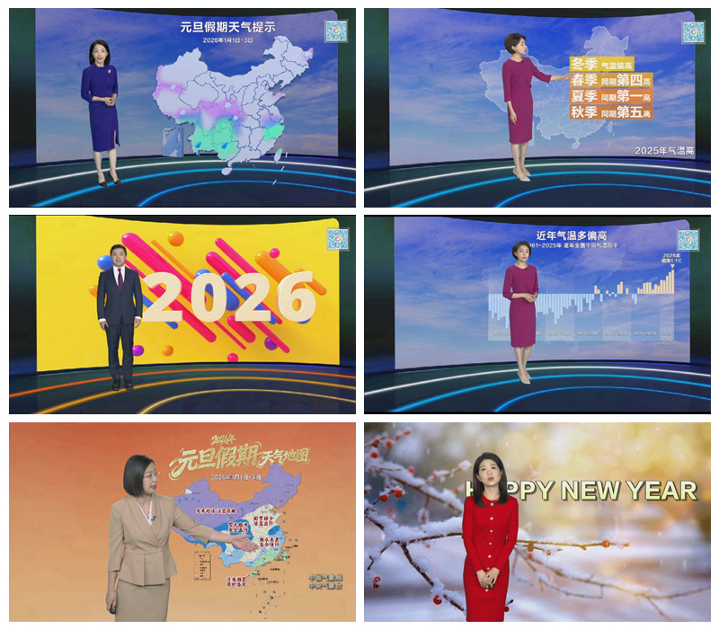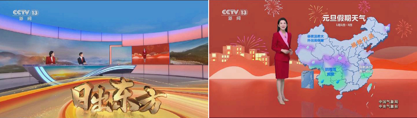 12月31日,CCTV1/13《新闻联播天气预报》、CCTV1/13《朝闻天下天气预报》提前解读元旦假期各区域天气特点。2026年元旦当天,CCTV1/13《新闻联播天气预报》、CCTV4《中国新闻天气预报》、CGTN《天气预报》栏目使用契合元旦氛围的背景和图形画面,结合天气内容为公众出行做好路况、穿衣等方面提示和建议。