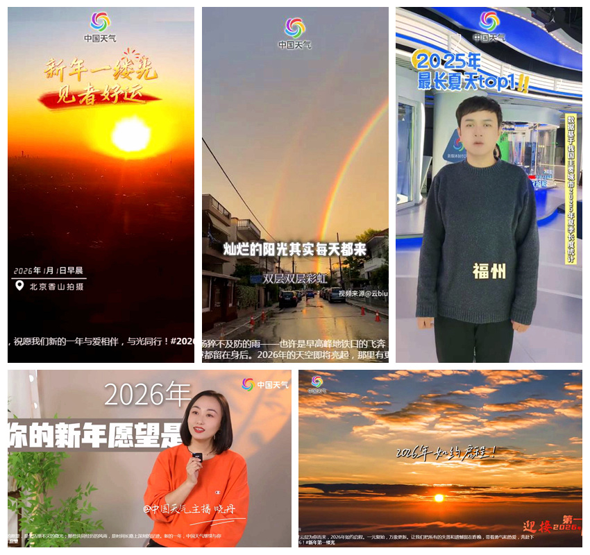 短视频内容则以温暖、互动为主线,推出《2026年 你的新年愿望是什么》《2025年我们都在自己的天气里穿行》《迎接2026年第一缕阳光,接好运》等,赋予气象服务情感厚度。