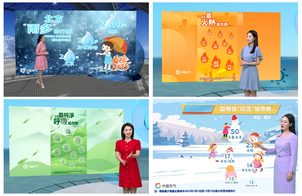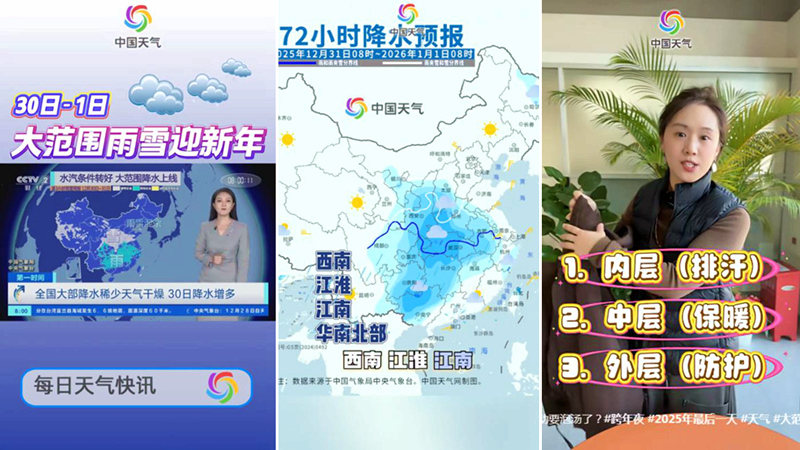 岁末年初之际,“中国天气”策划、发布一系列媒体服务产品,产品既有充满人文关怀的跨年直播,也有理性专业的年度天气盘点,还包括温暖实用的元旦出行出游地图等,在电视端、网站、新媒体多平台发布。产品服务内容各有侧重,但“中国天气”品牌为公众服务的初心和使命始终不变,和万千网友共同送别2025年,迎接2026年。